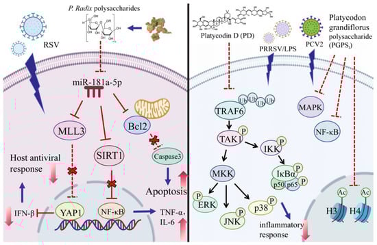 PD decreases PRRSV-induced and lipopolysaccharide-induced cytokine inflammatory factor production in primary porcine alveolar macrophages [76]. PD binds to TRAF6, reducing its K63 ubiquitination and inhibiting the activation of the MAPK and TAK1/IKK/NF-κB pathways, downregulating the overactivated inflammatory response and immune cell infiltration, which improves the survival rate of influenza [95]. PGPSt can mitigate the inflammatory factor expression caused by porcine circovirus type 2 through the modulation of histone acetylation and inhibiting the activation of NF-κB and MAPK signaling pathways, thereby reducing the release of inflammatory factors and pro-inflammatory enzymes [27]. PGPSt improves respiratory syncytial virus-induced inflammation through Hippo and SIRT1 pathways, which is mediated by miR-181a [25] (Figure 2).