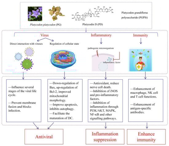 The anti-inflammatory and immunomodulatory activities of PG have garnered considerable interest in recent years [28,29,30,31]. Inflammation serves as a host defence mechanism against injury and infection. However, excessive or chronic inflammation can lead to tissue damage and disease. Studies indicate that Platycodon saponins can inhibit the expression of inflammatory mediators, thereby reducing inflammation [32]. Additionally, Platycodin D (PD) has been shown to enhance immune defence in mice by increasing serum antigen-specific antibody titres, promoting transcription factor and Th1/Th2 cytokine expression in spleen cells, and enhancing the cytotoxic activity of natural killer (NK) cells [33]. These findings highlight PG as a promising candidate for treating immune-related diseases and inflammatory conditions. This article reviews current research on the role of PG in preventing and treating viral diseases to provide a comprehensive overview of scientific progress and suggest directions for future research on PG in preventive and therapeutic applications. These findings highlight PG as a promising candidate for treating immune-related diseases and inflammatory conditions. However, the role of PG in virus-associated host response lacks systematic review.