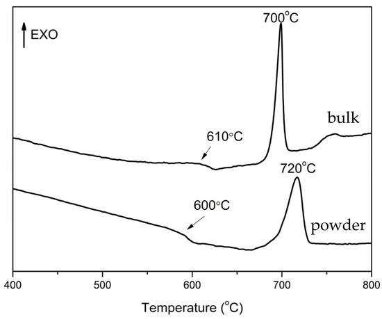 The DTA curves for the bulk and powder samples of 52WO3:22B2O3:26La2O3:0.5Eu2O3 glass at a heating rate of 10 K/min are shown in Figure 1. An endothermic dip for the glass transition and exothermic peak for crystallization are clearly observed in both samples. The values of the glass transition and crystallization peak temperatures are Tg = 610 °C and Tc = 700 °C for the bulk sample, and Tg = 600 °C and Tc = 720 °C for the powder glass sample. The difference in the Tc values of bulk and powder 52WO3:22B2O3:26La2O3:0.5Eu2O3 glass implies that a surface crystallization is taking place in this glass. The glass-ceramics (GCs) have been prepared by heat treatment of the precursor glass 52WO3:22B2O3:26La2O3:0.5Eu2O3 at 680 °C, which is the temperature at the beginning of the glass crystallization peak in the DTA curve of the bulk glass sample for 3 h, 6 h, 9 h, 15 h, 18 h, and 21 h.