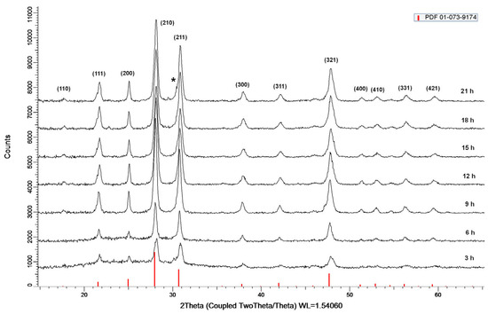 Figure 2 shows the powder diffraction patterns after crystallization of glass with composition 52WO3:22B2O3:26La2O3:0.5Eu2O3 at a temperature of 680 °C and a crystallization time of 3, 6, 9, 12, 15, 18, and 21 h, respectively. The glass-ceramics obtained after heat treatment of the parent glass for different lengths of time are designated as GC-3 h, GC-6 h, GC-9 h, GC-12 h, GC-15 h, GC-18 h, and GC-21 h, respectively.