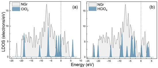 To investigate the specific reaction mechanism, the chlorine-containing groups (HClOx, ) and other groups (OH, O) were studied, respectively. The adsorption of HClO4 and its decomposition products on the N-Gr surface were probed, and the results of geometry optimization obtained together are presented later as reaction IS images. The results show that HClO4 and its decomposition products did not bond with C atoms on the N-Gr surface. In addition, the adsorption energies of HClOx (x = 1~4) molecules on the N-Gr surface were calculated as −0.167~−0.031 eV, and the adsorption energies of , , and ClO− on the N-Gr surface were found to be −1.214 eV, −0.183, and −0.368 eV, respectively. Clearly, the adsorption energy of on the N-Gr surface was larger. In order to confirm the adsorption properties more accurately, the localized density of states (LDOS) was employed to study their interactions with N-Gr. The LDOS diagram of the HClO4 molecule and its decomposition products on the surface of N-Gr are shown in Figure 1.