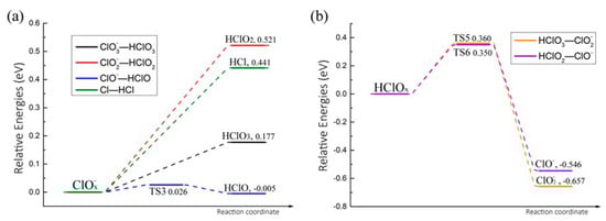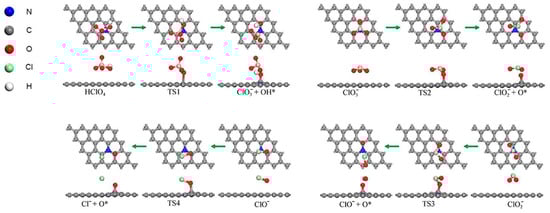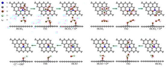 Along the oxygenated chlorate pathway (blue arrows in Figure 10), the HClO4 molecule gradually broke the Cl-O bond, which generated HClO3, HClO2, HClO molecules and Cl atoms in turn, and dissociated O and OH adsorbed on the N-Gr surface. However, the deoxygenation reaction of HClO4 molecules had a high reaction activation energy, so it was difficult for such molecules to decompose directly on the N-Gr surface. The purple arrows in Figure 11 showed the interconversion reactions between the intermediates of the two different pathways and their activation energies. The results showed that, even though the HClO3 molecule was generated at the N-Gr surface, it prefers to react directly with O atoms, adsorbing on o-C atoms, to form and OHad molecules or to undergo dehydroxylation rather than deoxygenation along the oxygenated chloric acid pathway.