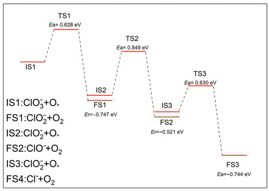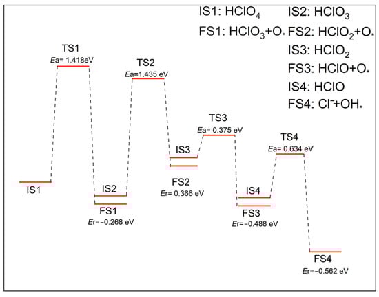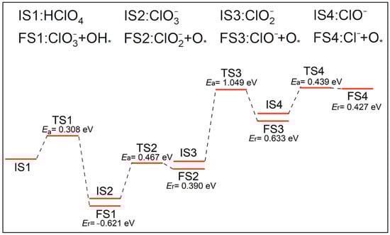 After discussing the different reaction paths, the decomposition mechanism of the HClO4 molecule on the N-Gr surface was determined through the reaction relationships of the individual intermediates, and the activation energies and reaction heats were listed. As shown in Figure 10, comparing the activation energies of the various reaction branches along the way, it is possible to determine the trends in the production and consumption of intermediates, thus clarifying the specific decomposition mechanism of HClO4.