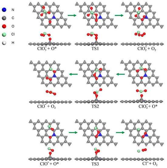 Optimized structures of decomposition reactions of PA along the oxygenated chlorate pathway, the symbol * indicates that the substance is chemisorbed on N-Gr and the green arrows indicate the reaction process for each elementary reaction.