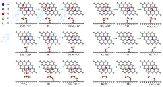 As shown in Figure 8, since the A1 reaction occurs after the adsorption of HClO4 molecules onto the N-Gr surface, the dissociated OH group was adsorbed onto N-Gr, where formed a hydrogen bond with the adsorbed OH group. After that, H atoms would transfer to form HClO3 molecules. The reaction required overcoming an energy barrier of 0.151 eV and absorbing heat of 0.177 eV. The value of reaction heat was higher than the barrier, implying that the process is a heat-absorbing reaction with no barrier. Furthermore, the reactions of proton transfer reactions between , ClO−, and Cl− and OHad groups were all the same as that of , in which the protonation reactions of and Cl− are also barrierless and heat-absorbing reactions. Frequency analysis and transition state confirmation also confirm the above conclusions. Additionally, the activation energy and heat of reaction for the reaction between ClO− and OHad were 0.026 and −0.005 eV, respectively. Low values signify that the reverse reaction of this reaction is equally easy to occur.