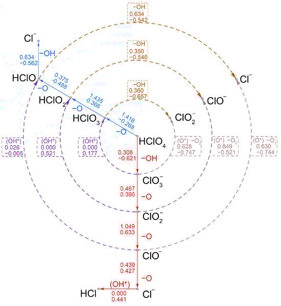 Some researchers intended to ascertain the decomposition path of AP by analyzing its decomposition products. It was concluded that, when Co3O4 or ZnO were used as catalysts, the HClO2 and HClO molecules were detected as products [27,28]. Therefore, the decomposition path was proposed in which HClO4 loses its O atoms and experiences decomposition. In this reaction path, HClO4 proceeds to successive Cl-O bond breaks until finally the HO-Cl bond breaks to form Cl− and OH. This reaction path was noted as reaction route B, as shown below.