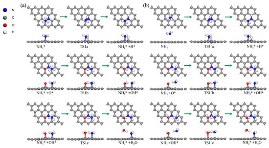 The optimized structures of dehydrogenation reactions of NH3 absorbed on N-Gr surfaces. (a) reaction structure of NH3 chemisorbed onto N-Gr; (b) reaction structure of NH3 physisorbed onto N-Gr, the symbol * indicates that the substance is chemisorbed on N-Gr. and the green arrows indicate the reaction process for each elementary reaction.