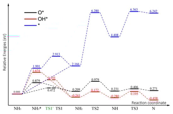 Apart from HClO4, NH3 is also a primary product of AP decomposition. Meanwhile, it was mentioned that, with the decomposition of HClO4, O atoms and OH groups may be adsorbed on the catalyst surface [27,29]. So, this section discusses the decomposition process of NH3 on the N-Gr surface under different circumstances.
