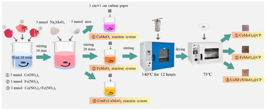 The chemical reagents utilized in this study were of analytical grade and procured from Sigma Chemical Reagent Co., Ltd. (Shanghai, China). Carbon paper (model: TGP-H-060; brand: Toray) was obtained from Suzhou Sinero Technology Co., Ltd. (Suzhou, China). The material synthesis process was illustrated in Figure 1. The synthesis of CoMoO@CP material via hydrothermal method was conducted as follows: Initially, 3 mmol of cobalt nitrate (Co(NO3)2, Sigma Chemical Reagent Co., Ltd., Shanghai, China) was dissolved in 50 mL of deionized water, and the solution was stirred for 30 min. Subsequently, 3 mmol of sodium molybdate (Na2MoO4, Sigma Chemical Reagent Co., Ltd., Shanghai, China) and 5 mmol of urea (Sigma Chemical Reagent Co., Ltd., Shanghai, China) were sequentially introduced into the solution, which was then stirred for an additional 30 min until complete dissolution of the reagents. A carbon paper substrate (1 cm × 1 cm) was then immersed into the solution, which continued to be stirred for another 40 min. The resulting mixture was transferred to a 100 mL stainless steel autoclave lined with Teflon and subjected to hydrothermal treatment at 140 °C for 12 h.