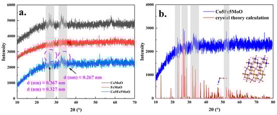 The XRD analysis results of CoMoO, FeMoO, and Co5Fe5MoO powder materials (a); the comparison of XRD patterns of actual Co5Fe5Mo and theoretical crystal structure (b).
