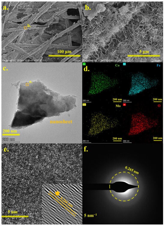 Micro-morphology was a crucial property of electrocatalytic materials, and Figure 3 presented the SEM and TEM analysis results for the Co5Fe5MoO@CP composite. As shown in Figure 3a, following the hydrothermal synthesis, the surface of the carbon paper fibers was covered with a substantial layer of reaction products. This coating morphology probably enhanced the electron transfer between the carbon paper fibers and the active catalytic surfaces during the electrocatalytic processes. Upon higher magnification (see Figure 3b and Figure S10), the reaction products clearly exhibited a nanoflower morphology. The nanoflower sheets were approximately 50–100 nm in thickness and 1–2 μm in length. This distinctive morphology provided a significant number of active sites for electrocatalytic reactions. The subsequent SEM wide-range EDX mapping analysis (see Figures S11 and S12) revealed that the primary elemental composition of the areas shown in Figure 3b and Figures S11 and S12 included cobalt, iron, molybdenum, oxygen, and carbon, which aligned with the elemental composition of both carbon paper and the Co5Fe5MoO material. More precise analytical results were obtained through TEM analysis, as illustrated in Figure 3c–f. Figure 3c clearly displayed the morphology of a single nanoflower sheet, with side lengths ranging from approximately 200 nm to 1 μm. TEM–EDX analysis further confirmed that cobalt, iron, molybdenum, and oxygen were uniformly distributed within the nanoflower particles, corroborating the presence of these four elements. High-resolution TEM (HRTEM) images and diffraction ring patterns of the Co5Fe5MoO@CP material were shown in Figure 3e,f. The HRTEM results revealed distinct diffraction fringes corresponding to a crystal plane spacing of 0.266 nm, which aligned closely with the peak observed at approximately 32.7° in the XRD results (Figure 2a). Similar findings could also be obtained from Figure 3f, and the clear diffraction ring belonging to 0.265 nm could be observed. These results further supported that the nanoflower sheets possessed the theoretical crystal structure depicted in Figure S1.