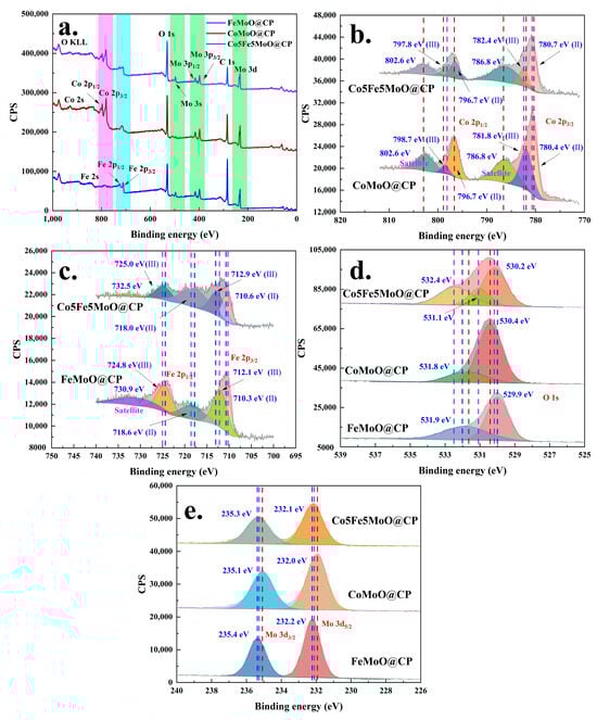 The XPS analysis results of CoMoO@CP, FeMoO@CP, and Co5Fe5MoO@CP materials: full spectrum scanning (a); high resolution XPS of Co2p (b); Fe 2p (c); O 1s (d); and Mo 3d (e).
