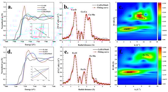 The Co K-edge XAFS analysis results of Co foil, CoO, Co2O3, and Co5Fe5MoO materials (a), the corresponding Fourier-transform and theoretical structure fitting spectra of Co for Co5Fe5MoO material (b), and the wavelet transform Co K-edge of Co5Fe5MoO material (c). The Fe K-edge XANES analysis results of Fe foil, Fe2O3, and Co5Fe5MoO materials (d), the corresponding Fourier-transform and theoretical structure fitting spectra of Fe for Co5Fe5MoO material (e), and the wavelet transform Co K-edge of Co5Fe5MoO material (f).