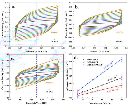 The CV curves of non-Faraday region (different scanning speeds): ((a): Co5Fe5MoO@CP, (b): CoMoO@CP, and (c): FeMoO@CP); plots of capacitive current density vs. different scan rate for Cdl (d).