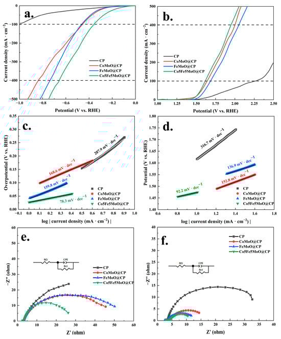 Furthermore, linear sweep voltammetry (LSV) and subsequent data analysis were utilized to evaluate the HER and OER activities of materials, with the results depicted in Figure 7 and Figures S23–S26. As shown in Figure 7a, the HER overpotential for the Co5Fe5MoO@CP material was 123.6 mV at 10 mA·cm−2 (see Figure S23), 353.2 mV at 100 mA·cm−2, and 658.0 mV at 400 mA·cm−2. These values were significantly lower compared to those of single-element molybdate composites (FeMoO@CP and CoMoO@CP) and the original carbon cloth. Furthermore, when compared to dual-element molybdates with other cobalt/iron ratios (see Figure S24), the Co5Fe5MoO@CP composite demonstrated the lowest HER overpotential. The subsequent analysis of the steady-state region of the linear sweep voltammetry curves provided the Tafel slopes for the hydrogen evolution reaction, as illustrated in Figure 7c and Figure S25. The data indicated that, among single-element and dual-element molybdate systems (with varying cobalt/iron ratios), the Co5Fe5MoO@CP system exhibited the smallest Tafel slope value of 78.3 mV·dec−1. This suggested that the Co5Fe5MoO@CP system required the least potential increase to achieve a tenfold increase in reaction current density, thereby making the reaction process the most economical. Based on the Tafel slope values and the hydrogen evolution mechanism under alkaline conditions, it could be inferred that the Co5Fe5MoO@CP system followed the Volmer–Heyrovsky reaction pathway [44,45]. Moreover, electrochemical impedance spectroscopy (EIS) was then employed to assess the internal resistance and charge transfer resistance during the reaction process, with results presented in Figure 7e and Figure S26. The analysis revealed that, despite similar internal resistance values (RΩ: about 2.65 Ω) across all four systems due to comparable reaction setups, there were notable differences in charge transfer resistance (Rct). Specifically, the Co5Fe5MoO@CP system demonstrated the lowest charge transfer resistance of 11.2 Ω among all the materials, implying that its electronic transmission efficiency was the highest during the HER process [46,47].