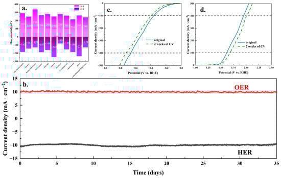 The recent literature results about HER and OER overpotential (a); the HER and OER i-t test of Co5Fe5MoO@CP material for 35 days (b); the HER and OER LSV polarization curves before and after the stability test of 2 weeks of CV cycles (c,d).