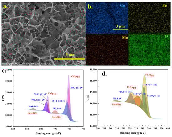 The stability of catalytic performance was crucial for the efficacy of catalytic materials. Figure 8b–d presented the results of the electrocatalytic stability tests for the Co5Fe5MoO@CP composite. As illustrated in Figure 8b, the current densities for both hydrogen and oxygen evolution reactions remained at 10 mA·cm−2 for 35 days at the appropriate potentials. Figure 8c further demonstrated that, after 2 weeks of CV cycles, the overpotential for the HER increased to 169.6 mV at 10 mA·cm−2, 388.9 mV at 100 mA·cm−2, and 717.9 mV at 400 mA·cm−2. Similarly, the overpotential for the OER increased to 261 mV at 10 mA·cm−2, 451 mV at 100 mA·cm−2, and 770 mV at 400 mA·cm−2 after 3000 CV cycles. These results indicated that the Co5Fe5MoO@CP material demonstrated satisfactory stability in catalytic performance. In addition to catalytic activity, the stability of the structure and elemental composition was also critical to catalytic materials. Figure 9 showed the SEM and XPS analysis results of the Co5Fe5MoO@CP composite after stability testing for both HER and OER. The SEM images in Figure 9a,b revealed that the material retained its nanoflower morphology and continued to contain cobalt, iron, molybdenum, and oxygen elements following the stability tests. Comparing the composition ratios of main elements before and after the stability reaction (Table 1), it can be seen that after a long period of hydrogen and oxygen evolution reactions, the surface elements of Co5Fe5MoO@CP composite were stable with little change in element ratios. High-resolution XPS analysis (Figure 9c,d) revealed that the peak positions and shapes of the cobalt and iron elements (key catalytic sites) remained relatively stable. This stability indicated that the valence states of cobalt and iron were preserved throughout the catalytic process. The results demonstrated that, following the HER and OER stability tests, the Co5Fe5MoO@CP composite maintained its excellent structural integrity and elemental composition, including the valence states of its constituent elements. This robustness in both catalytic performance and structural composition underscored the material’s suitability for subsequent practical applications.