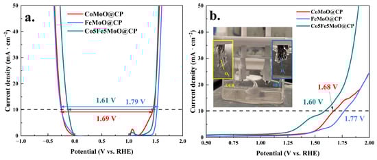 The above research findings demonstrated that the Co5Fe5MoO@CP composite exhibited notable catalytic activity for both HER and OER. Figure 10a presented the combined results of HER and OER, revealing that in the Co5Fe5MoO@CP system, the potential difference between the two electrodes at a current density of 10 mA·cm−2 was 1.61 V. This value was significantly lower compared to that of the FeMoO@CP and CoMoO@CP systems. Similar findings were evident from the two-electrode overall water splitting reaction results depicted in Figure 10b. Specifically, a cell voltage of just 1.6 V, approximating the voltage of a commercial dry battery, sufficed to initiate the reaction and achieve a current density of 10 mA·cm−2 for the entire overall water splitting process. Driven by two commercial dry batteries, the overall water splitting reaction proceeded continuously and efficiently, as illustrated in Figure S31.
