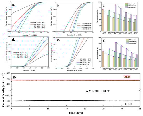 The HER IR-corrected LSV polarization curves of Co5Fe5MoO@CP system under different KOH concentrations and 25 °C (a) and different temperatures and 6 M KOH (b). The HER overpotential of catalytic systems at 500, 1000, and 2000 mA·cm−2 (c). The OER IR-corrected LSV polarization curves of Co5Fe5MoO@CP system under different KOH concentrations and 25 °C (d) and different temperatures and 6 M KOH (e). The OER overpotential of catalytic systems at 500, 1000, and 2000 mA·cm−2 (f). The HER and OER i-t test of Co5Fe5MoO@CP composite material for 35 days under 6 M KOH and 70 °C conditions (g).