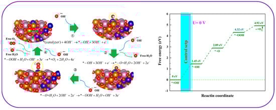 The oxygen evolution reaction (OER), comparable to the hydrogen evolution reaction (HER), was structured into four distinct steps, as characterized by Equations (6) to (9) [44,49]. The DFT calculation findings for these steps were displayed in Figure 14. Regarding optimal configurations, hydroxyl groups, oxygen atoms, and OOH groups were primarily found in proximity to cobalt atoms. Consequently, in contrast to the HER process, the cobalt atoms played a unique role as the exclusive catalytic active sites for the OER. Additionally, unlike the HER process, the OER presented a notable free energy increase of 4.92 eV from the initial reactants to the end products. A substantial free energy barrier required that the OER took place in a progression of gradual steps, with each step being interconnected and limited by the total increase in free energy [50,51]. The free energy variations for each step in the OER were recorded at 1.45 eV, 1.44 eV, 1.43 eV, and 0.6 eV, respectively. The initial step, which represented the highest increase in free energy, was pinpointed as the rate-limiting step of the overall reaction. This step was essential as its energy demands influenced the feasibility of the subsequent steps.