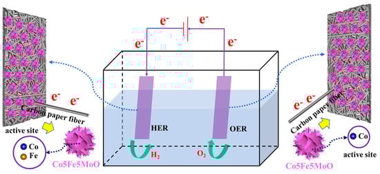 Based on the acknowledged features of carbon paper and the results from DFT analyses of catalytic surface processes (both HER and OER), the entire catalytic mechanism could be summarized as depicted in Figure 15. In the HER process, the carbon paper fibers played a crucial role in efficiently transferring electrons to the active sites of the Co5Fe5MoO composite located on the surface. The hydrogen evolution reaction was accomplished through four consecutive steps: water molecule adsorption, catalytic water decomposition, hydroxide ion formation, and hydrogen generation, facilitated by the synergistic actions of iron and cobalt atoms. Notably, the cobalt atom in Co5Fe5MoO functioned as a solitary active site during the oxygen evolution reaction, facilitating the sequential progression of the four-step OER process. Subsequently, the electrons produced throughout the reaction were efficiently shuttled away by the carbon paper fibers, thereby enabling the concurrent operation of both HER and OER reactions, with Fe and Co serving as active sites for HER and Co as the active site for OER.
