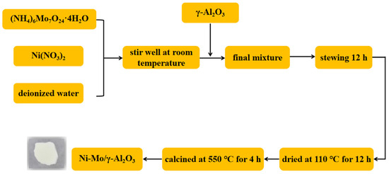 As shown in Figure 1, a mixed solution was formed by dissolving (NH4)6Mo7O24·4H2O and Ni(NO3)2 (Ni:Mo = 1:2.4) in an appropriate amount of deionized water using the impregnation method. γ-Al2O3 was added with Ni/Mo loading of 10 wt.%, standing for 12 h, dried at 110 °C for 12 h, and calcined in a tube furnace at 550 °C for 4 h to obtain Ni-Mo/γ-Al2O3 bimetallic catalyst.