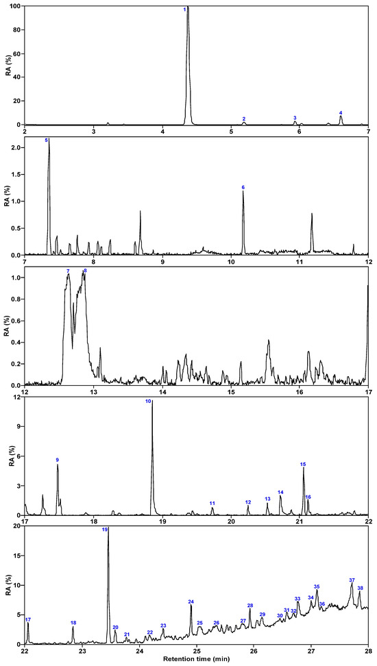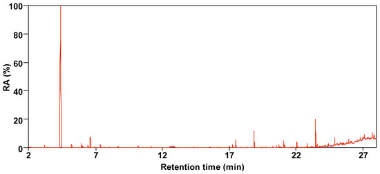 Figure 3 and Figure 4 show the total ion chromatogram of SBC-L, with a retention time of 2–28 min selected. The number of compounds detected in SBC-L by GC/MS is 38, which can be divided into 5 categories: alkanes, aromatics, oxygen-containing organic compounds (OCOCs), nitrogen-containing compounds (NCOCs), and other heteroatomic-containing organics (OHACOCs).