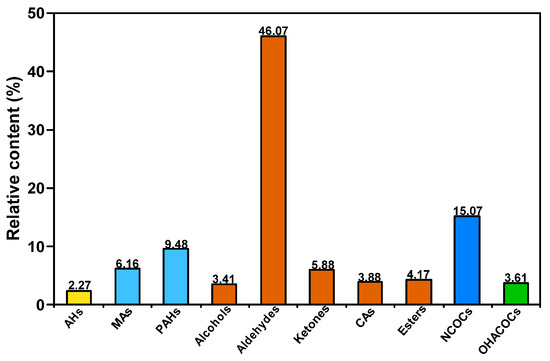 Figure 5 presents the distribution of the group composition of SBC-L. As can be seen from the figure, SBC-L is predominantly composed of oxygen-containing compounds with a relative content of 63.41%, followed by aromatic hydrocarbons (15.64%). Among them, the oxygen-containing organics mainly include alcohols, aldehydes, ketones, esters, and carboxylic acids, with aldehydes being the dominant group (46.07%).