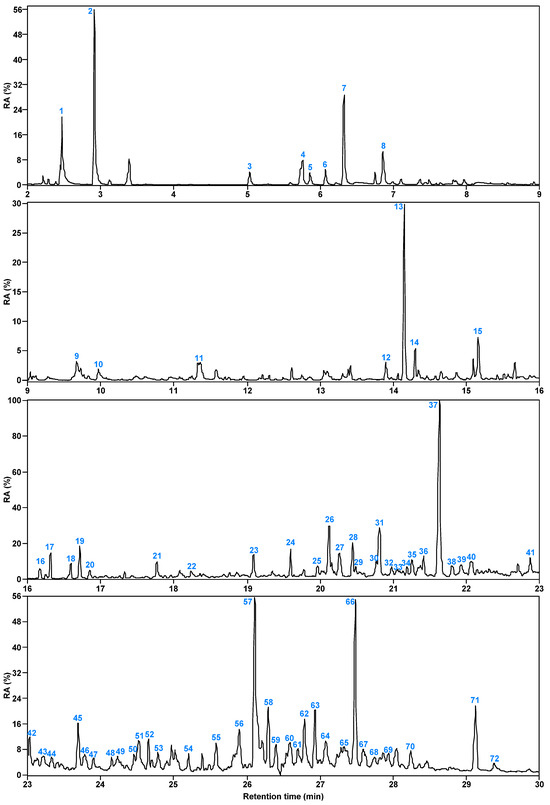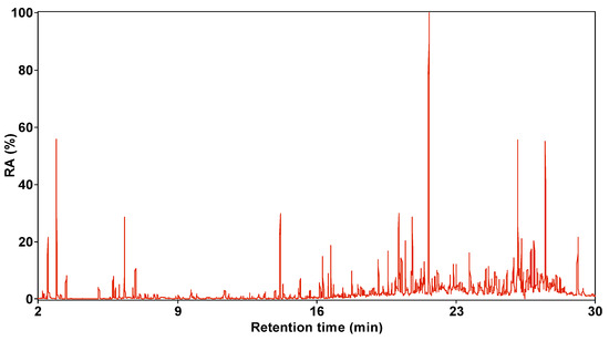 Figure 6 and Figure 7 present the total ion flow chromatograms of SBC-LIP320 with a retention time of 2–30 min. Through GC/MS analysis, 72 organic compounds were identified in SBC-LIP320, including alkanes, aromatic hydrocarbons, OCOCs, and NCOCs.
