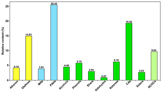 Table 3 lists the organic compounds detected in SBC-LIP320 along with their relative contents. According to the table, SBC-LIP320 contains 11 alkanes, 26 aromatic hydrocarbons, 29 OCOCs, and 6 NCOCs. Among them, hydrocarbons are primarily alkenes with a relative content of 14.91%, followed by alkanes (4.14%); aromatic hydrocarbons are mainly polycyclic aromatics (25.44%), followed by monocyclic ones (3.83%).