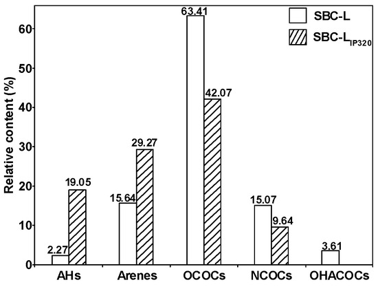 Figure 9 presents the distributions of the group composition of SBC-L and its catalytically hydrogenated products, SBC-LIP320. As shown in the figure, compared to SBC-L, the contents of alkanes and aromatic hydrocarbons detected in SBC-LIP320 increased, while the contents of OCOCs, NCOCs, and OHACOCs decreased, indicating that the catalyst of Ni-Mo/γ-Al2O3 might improve side-chain cracking and ring-opening reactions, increasing the contents of alkanes and arenes. The content of OCOCs shows the most significant change, indicating that Ni-Mo/γ-Al2O3 could effectively break C-O and/or C=O bonds. Thus, catalytic hydrogenolysis and hydrogenative deoxygenation and denitrogenation can simultaneously convert the oxygen- and nitrogen-containing organic compounds (in SBC-L) into other products (alkanes and arenes) and effectively remove the heteroatoms.