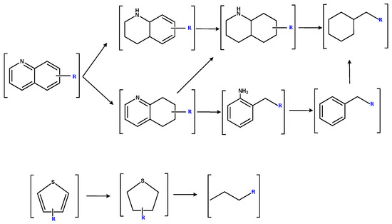 Possible hydrogenation pathways for quinoline and thiophene groups in SBC-L [22,23,24].