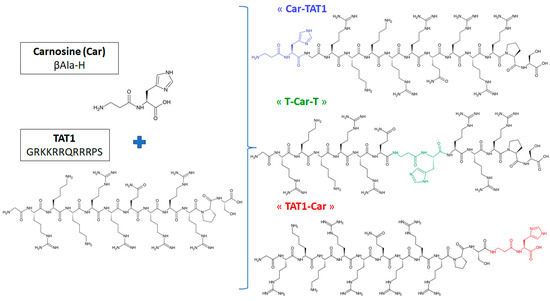 Amino acid sequences of carnosine (Car) and TAT1, along with the three isomeric peptides studied, are shown. The colour of carnosine indicates its position within the peptide: in Car-TAT1, carnosine (blue) is bound to the N-terminus; in TAT1-Car, carnosine (green) is bound to the C-terminus; and in T-Car-T, carnosine (red) is located in the middle of the TAT1 amino acid sequence.