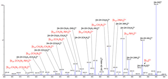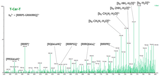 Figure 2 illustrates the high-resolution MS/MS spectrum of Car-TAT1, focusing on the m/z range of 800–900. The same fragment ions were also observed for TAT1-Car and T-Car-T. Peaks highlighted in red correspond to the conventional [b14]2+ ion and its consecutive neutral losses, primarily associated with the presence of arginine. The [b14]2+ ion, at m/z 877.52, corresponds to the loss of water and the formation of either a protonated oxazolone on the last residue at the C-terminal position or a macrocycle [57,58,59]. The other fragments (in black) do not correspond to conventional fragments and are uniquely due to neutral losses from arginine. These involve molecules such as ammonia (NH3), carbodiimide (CH2N2), and guanidine (CH5N3). Since the peptides are doubly charged, the masses of these neutral losses are halved. For example, the loss of ammonia corresponds to Δm/z = −17.0265/2 ≈ −8.51, the loss of water to Δm/z = −18.0105/2 ≈ −9.01, the loss of carbodiimide to Δm/z = −42.0218/2 ≈ −21.01, and the loss of guanidine to Δm/z = −59.0483/2 ≈ −29.52.