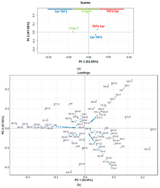 Principal Component Analysis (PCA) performed on the high-resolution MS/MS spectra of T-Car-T, TAT1-Car, and Car-TAT1 in the m/z range of 100–900. (a) Score plot of the two first principal components (the explained variance for PC1 is 52.05% and 47.95% for PC2). (b) Loading plot of PC1 vs. PC2. Each point (in blue) shows the loading of a mass peak (m/z) for PC1 (in x-axis) and PC2 (in y-axis).