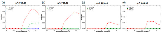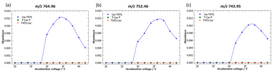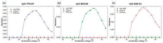 where Iprecursor is the intensity of the precursor ions peak, and Ifragment is the intensity of each fragment ions peak obtained from the MS/MS experiment. SY curves were generated by plotting SY values against the acceleration voltage (see Figure 3). The resulting curves show a high degree of overlap, making it impossible to differentiate between TAT1-Car and T-Car-T. However, Car-TAT1 exhibits a slightly lower SY across the voltage range, allowing for a subtle distinction from the other two peptides.