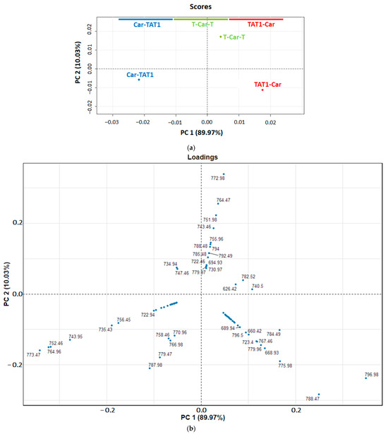 Principal Component Analysis (PCA) performed on the high-resolution MS/MS spectra of T-Car-T, TAT1-Car, and Car-TAT1 in the reduced m/z range of 600–800. (a) Score plot of the first two principal components, with PC1 explaining 89.97% of the variance and PC2 explaining 10.03%. (b) Loading plot of PC1 versus PC2. Each blue point represents the loading of a mass peak (m/z), with PC1 shown on the x-axis and PC2 on the y-axis.
