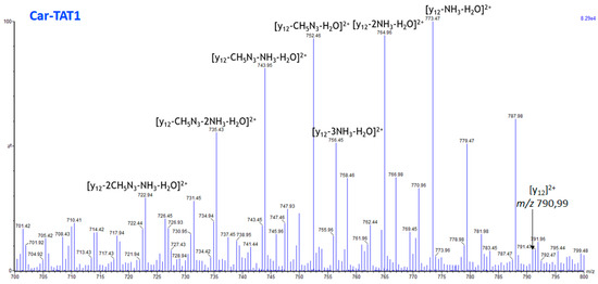This observation suggests a consecutive fragmentation pattern similar to that previously noted for Car-TAT1. Specifically, from m/z 772.98, the neutral loss of ammonia results in the consecutive peak m/z 764.47, while the loss of guanidine from m/z 772.98 results in the peak m/z 751.98.