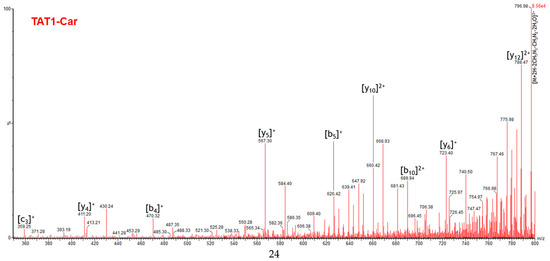 The following supporting information can be downloaded at: https://www.mdpi.com/article/10.3390/molecules30040853/s1, Figures S1 and S2: High-resolution MS/MS spectra of T-Car-T, TAT1-Car, and Car-TAT1, Figure S3: Breakdown curves of the major fragment ions, Figures S4 and S5: Loadings (line plot), Figure S6: Extract from the high-resolution MS/MS spectrum of Car-TAT 1 corresponding to the b2 ion, Figure S7: Conventional fragmentation of Car-TAT1 resulting in the complementary fragment ions b2 and y12, Figure S8: Conventional fragments observed for TAT1-Car.