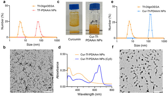 (a) Hydrodynamic size and (b) TEM image of Tf-PDAAm nanoparticles prepared by photo-PISA (scale bar: 500 nm); (c) photographs of free curcumin and Cur-Tf-PDAAm nanoparticles in PBS buffer; (d) UV-Vis spectra of Cur-Tf-PDAAm and Cur-Tf-PDAAm (Cy5) nanoparticles in PBS; (e) hydrodynamic size and (f) TEM image of Cur-Tf-PDAAm nanoparticles (scale bar: 500 nm).