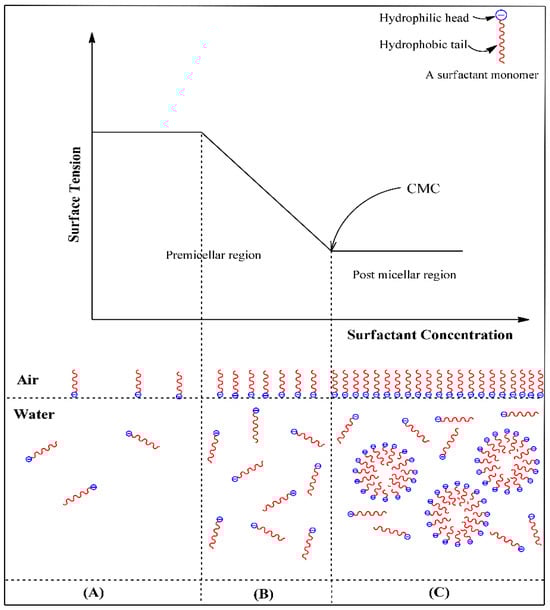 Representation of micellization behavior of surfactants in aqueous solution. (A) There is less reduction in surface tension at low surfactant concentrations. (B) Increasing the surfactant concentration, surface tension reduces steadily until CMC is reached. (C) No more changes in surface tension are verified beyond CMC. Taken from [25]. Copyright 2021 by the authors.