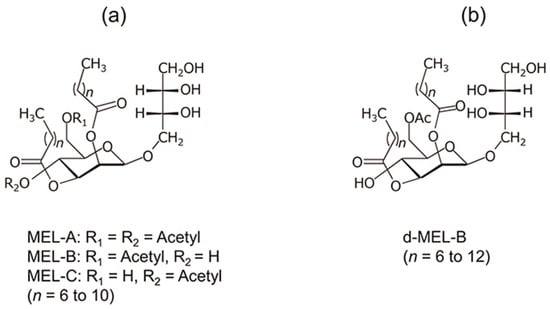 - Yamauchi, S.; Furukawa, M.; Kawahara, A.; Sugahara, T.; Yamamoto, S.; Kitabayashi, M.; Sogabe, A.; Shimoda, S.; Hata, E.; Watanabe, K.; et al. Roles of Mannosylerythritol Lipid-B Components in Antimicrobial Activity against Bovine Mastitis-Causing Staphylococcus aureus. World J. Microbiol. Biotechnol. 2022, 38, 54. [Google Scholar] [CrossRef]