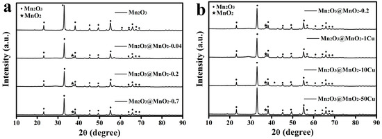 To investigate the phase structures of the synthesized Mn2O3 and MnO2, XRD patterns of the catalysts are tested and shown in Figure 1. The diffraction peaks marked with circles match well with JCPDS 41-1442 (bixbyite). The diffraction peak marked with star (2θ = 37.3°) is well indexed to (−111) of δ-MnO2 according to the standard card PDF# 80-1098. Characteristic peaks of Mn2O3 are presented in all XRD patterns of the samples, indicating an excess of Mn2O3 in the redox reaction between Mn2O3 and KMnO4. Notably, the (−111) characteristic peak for Mn2O3@MnO2-0.7 is weaker than that for Mn2O3@MnO2-0.2 (Figure 1a), suggesting a significant decrease in the crystallization quality of δ-MnO2 with increasing amounts of KMnO4 in the reaction system. Furthermore, the (−111) characteristic peak of the samples decreases when increasing the mass of Cu(NO3)2·3H2O in the reaction system, indicating that Cu doping adversely affects the crystallinity of δ-MnO2.