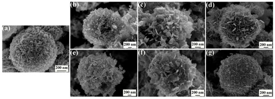 Figure 2 shows the SEM images of the prepared samples. As shown in Figure 2a, Mn2O3 exhibits a porous spherical morphology, which serves as an important structural foundation for the subsequent growth of δ-MnO2. In Figure 2b,c, it can be observed that the δ-MnO2 nanosheets are oriented almost perpendicular to the surface of Mn2O3, with their morphology varying significantly depending on the extent of the redox reaction, while the mesoporous spherical structure of Mn2O3 remains distinctly observable. When the KMnO4 increases to a certain extent in the reaction solution, the δ-MnO2 nanosheets adopt a flower-like morphology (Figure 2d). This alteration in morphology severely affects the exposure of Mn2O3, and markedly reduces the accessibility of the interface between Mn2O3 and δ-MnO2. In addition, the incorporation of Cu ions has a significant impact on the morphology of δ-MnO2. As shown in Figure 2e,f, the δ-MnO2 nanosheets become thinner with the incorporation of Cu ions. And when the Cu(NO3)2·3H2O increases to a certain extent in the reaction solution, most of the δ-MnO2 nanosheets fall down (Figure 2g), and it also seriously influences the exposure of the interface between Mn2O3 and δ-MnO2.