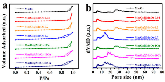 The nitrogen adsorption–desorption curves and BJH pore distributions are depicted in Figure 5. As illustrated in Figure 5a, the N2 adsorption—desorption isotherms for all catalysts exhibit a type IV classification, characterized by hysteresis loops indicative of capillary condensation occurring in the mesopores present on the catalyst surfaces. Furthermore, the presence of a type H3 hysteresis loop suggests the existence of slit-shaped pores within the catalysts. In addition, the content and morphology of δ-MnO2 are critical factors affecting the SBET, and the growth of δ-MnO2 nanosheets over Mn2O3 increased the SBET of the catalysts (Table 1). According to Figure 5b, the pore size distribution of Mn2O3 is primarily mesoporous (2–50 nm), with predominant pore sizes of approximately 4.9 nm to 26.4 nm. The formation of δ-MnO2 significantly reduced the size of the larger mesopores (approximately 26.4 nm), resulting in a decrease to 13.9 nm, while still remaining within the mesoporous range. Furthermore, the incorporation of Cu adversely affected the crystallinity and structural integrity of the δ-MnO2 nanosheets, resulting in the collapse of the nanosheets and the blockage of the mesopores (e.g., approximately 26.4 nm).
