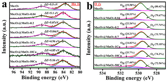XPS spectra of (a) Mn 3s and (b) O 1s in prepared samples: Mn2O3, Mn2O3@MnO2-0.04, Mn2O3@MnO2-0.2, Mn2O3@MnO2-0.7, Mn2O3@MnO2-1Cu, Mn2O3@MnO2-10Cu, and Mn2O3@MnO2-50Cu.