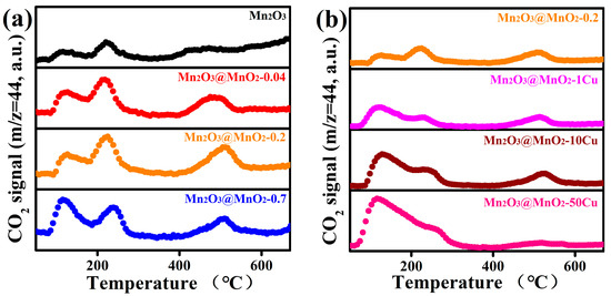 To verify the above conjecture, CO-TPD-MS was employed to detect CO2 (Figure 8), which is the sole product formed during CO oxidation, with the peak areas summarized in Table S2. The CO2 desorption between 60 °C and 300 °C was derived from the reaction between CO and the adsorbed oxygen on the catalyst surface. The amount of CO2 desorption follows the following sequence: Mn2O3@MnO2-0.04 < Mn2O3@MnO2-0.2 < Mn2O3@MnO2-0.7 < Mn2O3@MnO2-1Cu < Mn2O3@MnO2-10Cu < Mn2O3@MnO2-50Cu. This is consistent with the amount of adsorbed oxygen species on the catalyst surface in the XPS results. Meanwhile, we should note that Mn2O3@MnO2-0.2 and Mn2O3@MnO2-10Cu, which exhibit relatively good catalytic performance, released more CO2 than the other samples around 500 °C. The CO2 desorption around 500 °C resulted from the reaction between CO and the surface lattice oxygen, which indicates that surface lattice oxygen is an important oxygen species affecting catalyst activity. In summary, both surface-adsorbed oxygen and surface lattice oxygen are essential contributors to the oxidation of CO.
