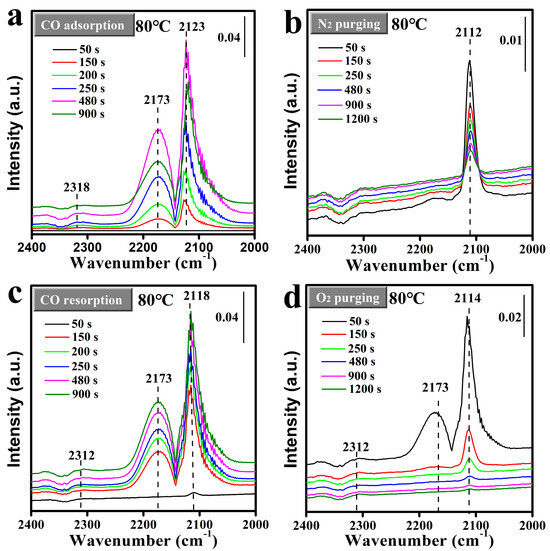 In situ DRIFTS study of (a) CO adsorption, (b) N2 purging, (c) CO resorption, and (d) O2 removal on Mn2O3@MnO2-10Cu. The catalysts were pretreated in situ at 200 °C under mixture gas (50% O2 and 50% N2) flow in the DRIFTS reaction cell before data collection (5% CO flow rate; 10 mL·min−1; N2 flow rate; 20 mL·min−1; O2 flow rate; 20 mL·min−1; and temperature, 80 °C).