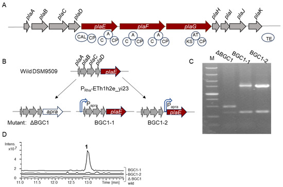 The 30 kb BGC pla contains a total of 11 genes, including two NRPS genes (plaE and plaF) and one type I PKS gene (plaG) (Figure 1A and Table S1). The functional annotations of the remaining genes are shown in Table S1. Bioinformatics analysis revealed that the plaE gene comprises five domains: a co-enzyme A ligase domain (CAL), a C domain, an A domain, and two peptidyl carrier protein (PCP) domains, with the A domain specifically recognizing the alanine (Ala) to generate an aminoacyl-adenylate intermediate. The gene plaF contains two modules, each containing a C domain, an A domain, and a PCP domain; however, the two A domains are not predicted to recruit their corresponding amino acids. The plaG gene consists of three domains: an AT domain, a KS domain, and an acyl-carrier protein (ACP) domain. The AT domain is responsible for the selection and transfer of a carboxylic acid such as acetyl-CoA to the ACP domain. Then, the KS domain catalyzes the condensation reaction to form carbon–carbon bonds between the starter and extender units. This process is further extended by the addition of a carboxylic acid via the KS domain, culminating in the synthesis of a longer fatty acid chain (FA). Therefore, it is anticipated that the BGC pla will produce a 3-amino-acid lipopeptide FA-Ala-X1-X2, where X denotes the amino acids whose specificity cannot be predicted. In addition to the core synthetic genes, this BGC also contains several additional synthase genes, including carbamoyltransferase (plaA) and carboxymuconolactone decarboxylase (plaB), acylhydrolase (plaC), and monooxygenase (plaH) (Table S1). As a result, BGC pla holds considerable promise for the production of new natural products.