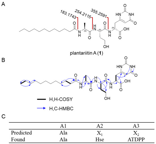 Structure elucidation of plantariitin A (1). (A) Complete structures of plantariitin A (1). Key MS/MS fragments (calculated values 183.17423, 254.2115, 355.2591 [M + H]+) showed losses of amino acid residues on the peptidic terminus of 1. (B) Key 1H–1H COSY (correlated spectroscopy) and HMBC (heteronuclear multiple-bond correlation spectroscopy) of 1. (C) The specificity-conferring code of A domains of BGC pla. Ala stands for alanine; Hse stands for homoserine. ATDPP stands for amino-1,2,3,6-tetrahydro-2,6-dioxo-4-pyrimidinepropanoic acid. X1 and X2 denote amino acids whose specificity cannot be predicted.